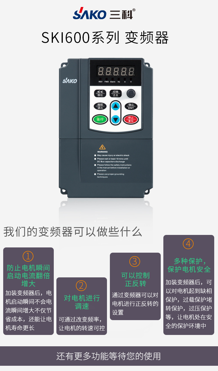 ⊙提供多種故障保護(hù)功能:過流、過壓、欠壓、過溫、缺相、過載等保護(hù)功能