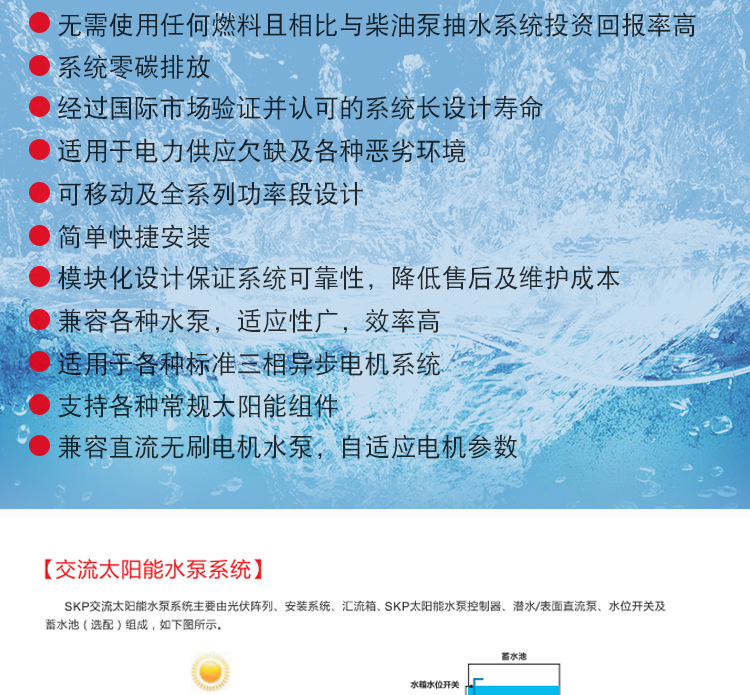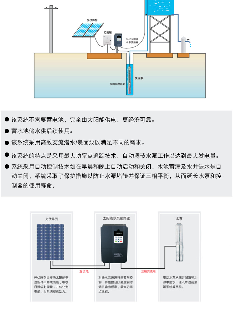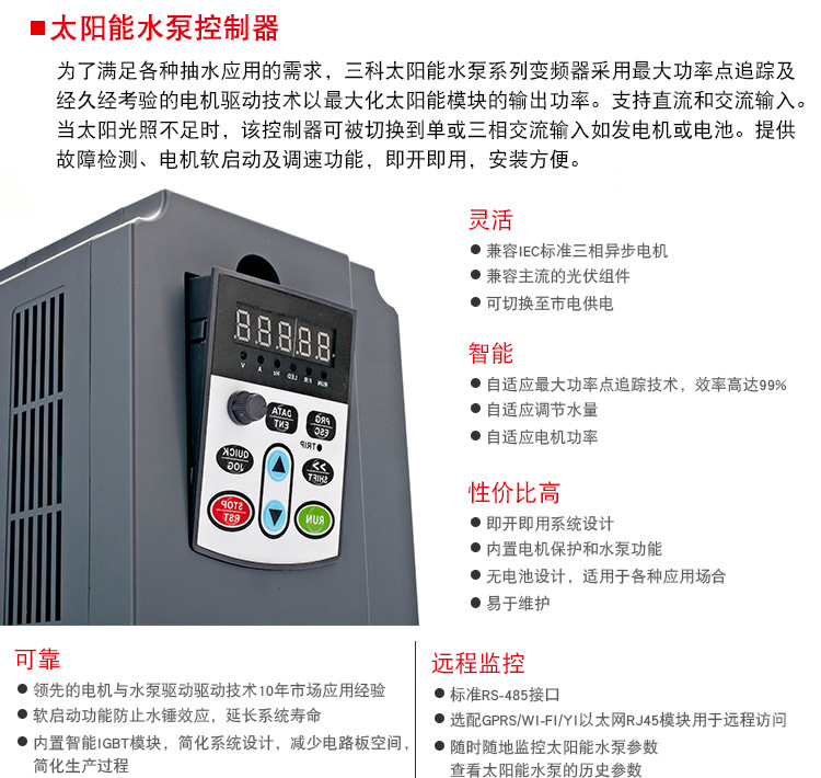 SK650系列變頻器是三科推出的針對(duì)光伏發(fā)電,驅(qū)動(dòng)三相交流水泵的變頻器,它采用大功率點(diǎn)追蹤及久經(jīng)考驗(yàn)的電機(jī)驅(qū)動(dòng)技術(shù)以催化增大太陽(yáng)能模塊的輸出功率,它將直流電直接逆變成三相交流電,可驅(qū)動(dòng)各類(lèi)交流水泵。同時(shí)它支持直流和交流輸入,當(dāng)沒(méi)有太陽(yáng)能時(shí),該變頻器手動(dòng)切換到單項(xiàng)或三相交流電輸入,如市電發(fā)電機(jī)或電池。SK650光伏水泵變頻器提供全方位保護(hù),電機(jī)軟啟動(dòng)及調(diào)速功能,即開(kāi)即用,安裝方便。| 產(chǎn)品型號(hào) | SKI650A075G-090G-4 | SKI650A090G-110G-4 | SKI650A110G-132G-4 |