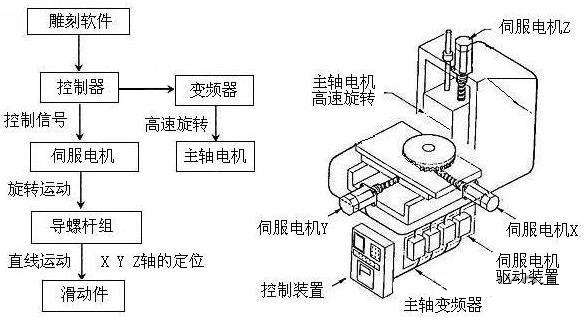 當(dāng)今主流數(shù)控雕刻機是由計算機、雕刻機控制器、雕刻機主體三部分組成,其工作原理是通過計算機內(nèi)配置的專用雕刻軟件進行圖樣設(shè)計和排版,經(jīng)由計算機把設(shè)計與排版的信息傳送至雕刻機控制器中,再由控制器把這些信息轉(zhuǎn)化成能驅(qū)動步進電機或伺服電機的脈沖信號,控制雕刻機主體上X、Y、Z三軸的雕刻走刀定位。同時,控制器啟動變頻器,帶動主軸電機的雕刻頭高速旋轉(zhuǎn),對固定于主機工作臺上的加工材料進行切削、鉆銑,即可雕刻出在計算機中設(shè)計的各種平面或立體的浮雕圖形及文字,實現(xiàn)雕刻自動化作業(yè),按照不同的加工材質(zhì)和工藝要求,可以搭配不同的專用配置刀具。