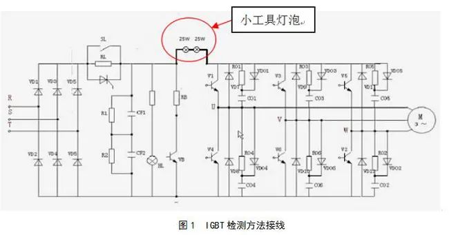 在具體運(yùn)用中,電路這些一般為聯(lián)接接地銅排或快熔,把聯(lián)接獎(jiǎng)牌和快熔除掉,將三相逆變電源IGBT正開關(guān)電源與直流電儲(chǔ)能技術(shù)電容器中間斷掉,把電燈泡接在兩點(diǎn)之間就可以。IGBT檢驗(yàn)方式布線如圖所示1所顯示。