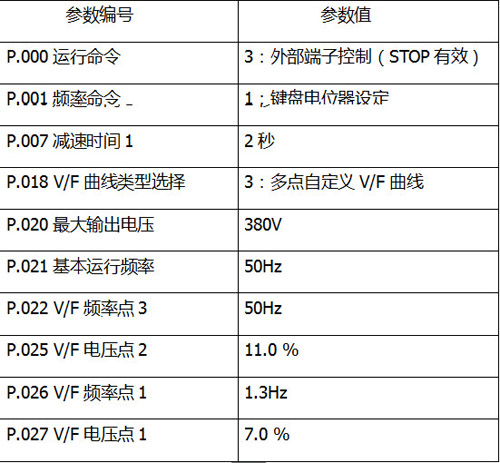 主機(jī)啟動命令外部端子給定,頻率命令面板電位器給定,變頻器低頻運(yùn)行,而且傳動輪之間的摩擦力較大,要求有高的啟動轉(zhuǎn)矩。